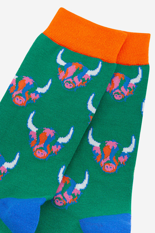 Men's Rainbow Highland Cow Print Bamboo Socks in Green