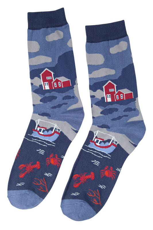 Mens Bamboo Socks Lobster Harbour Nautical Scene Blue