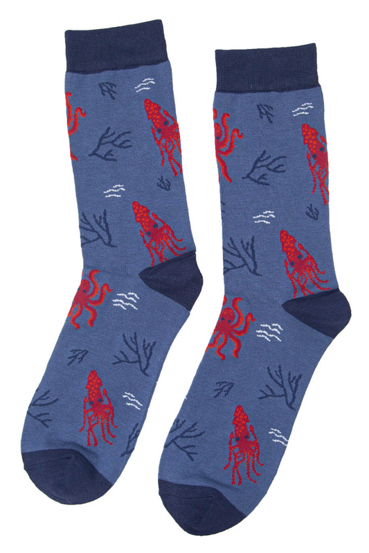 Mens Bamboo Socks Squid Octopus Print Novelty Dress Socks Blue