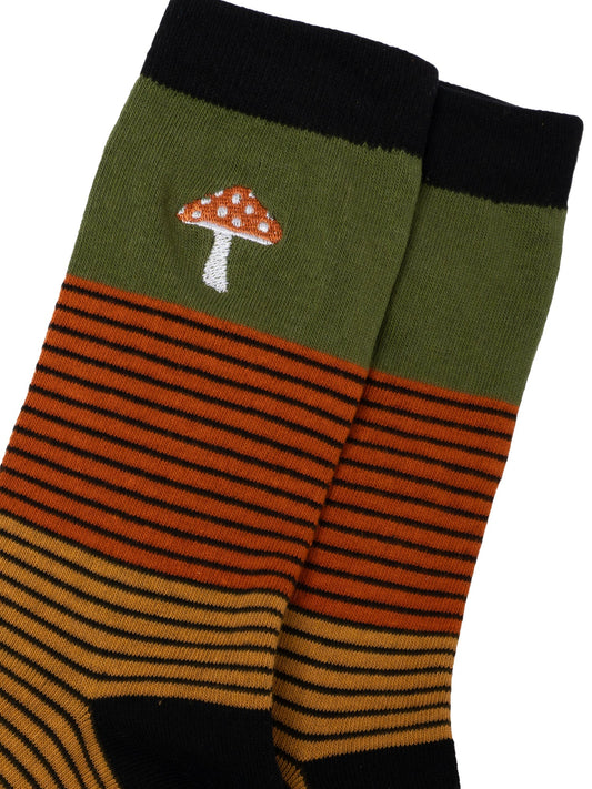 Embroidered Toadstool Striped Combed Cotton Socks in Khaki