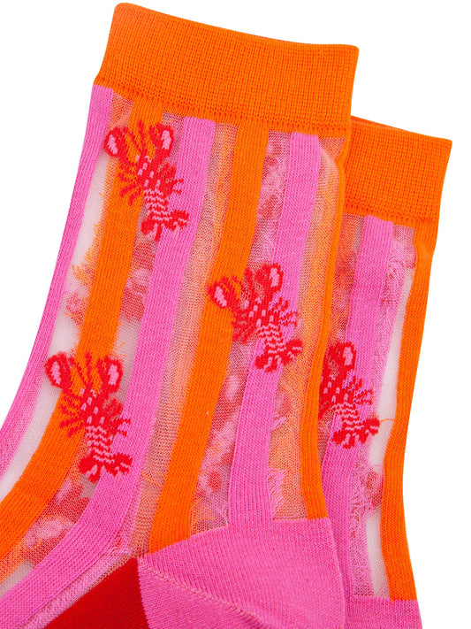 Lobster Stripes Combed Cotton Sheer Pop Socks in Pink/Red