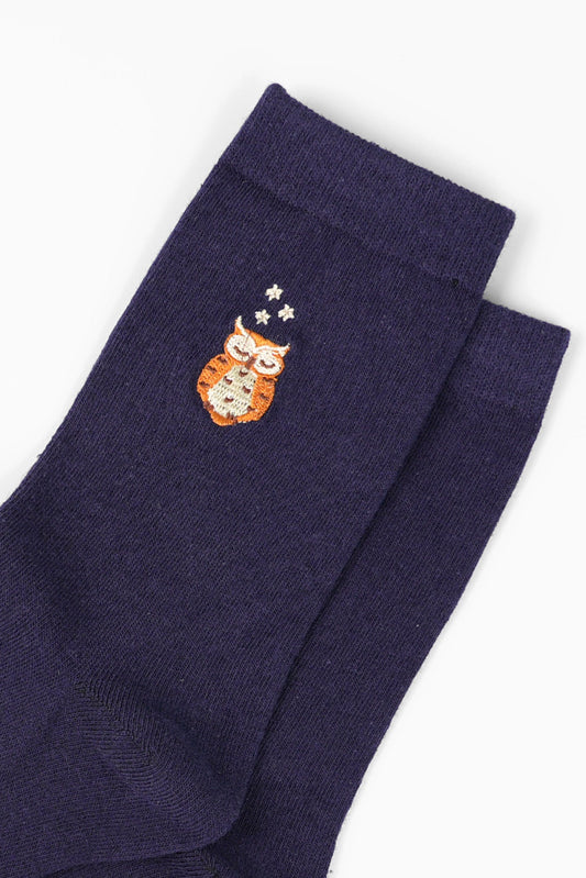 Women's Embroidered Ankle Socks- Navy Blue, Owl