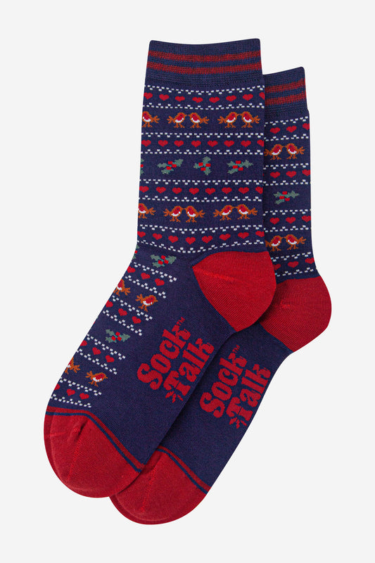Women's Bamboo Socks - Navy Blue/Red, Gingerbread Fair Isle