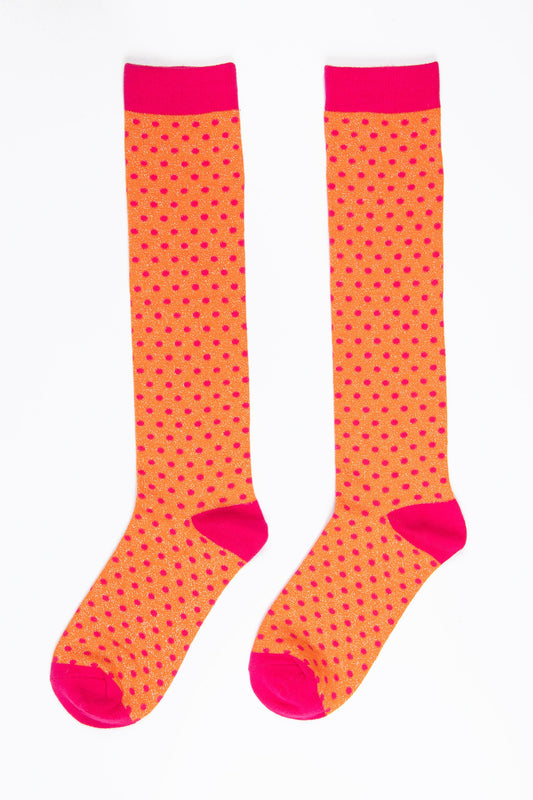 Women's Knee High Glitter Socks - Orange/Fuchsia, Small Polka Dot