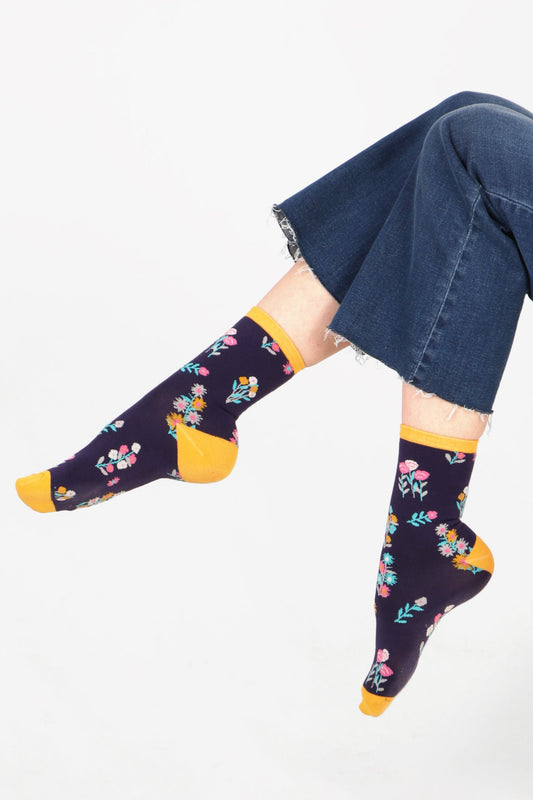 Womens Floral Bamboo Socks Novelty Ankle Socks Wild Flower Navy Blue