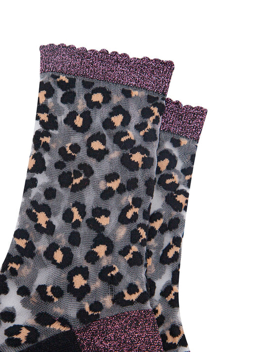 Leopard Print Combed Cotton Sheer Pop Socks in Black