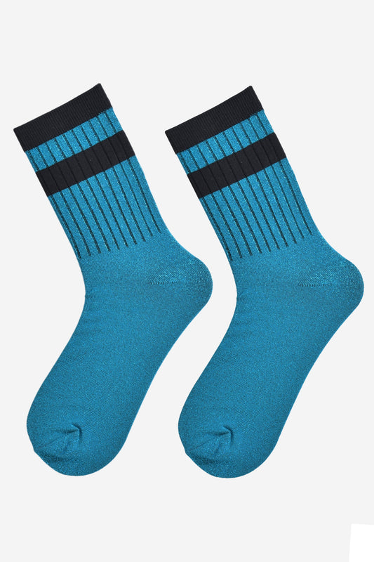 Striped Cuff Ribbed Cotton Glitter Socks in Teal/Black