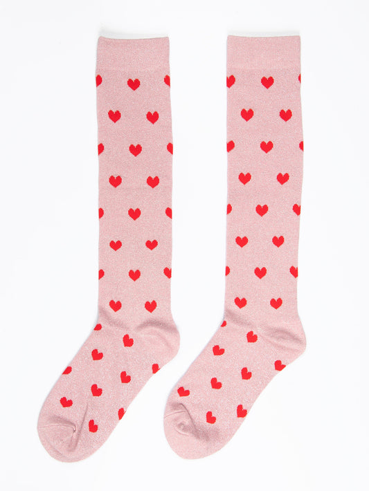 Love Heart Cotton Knee High Glitter Socks in Pink