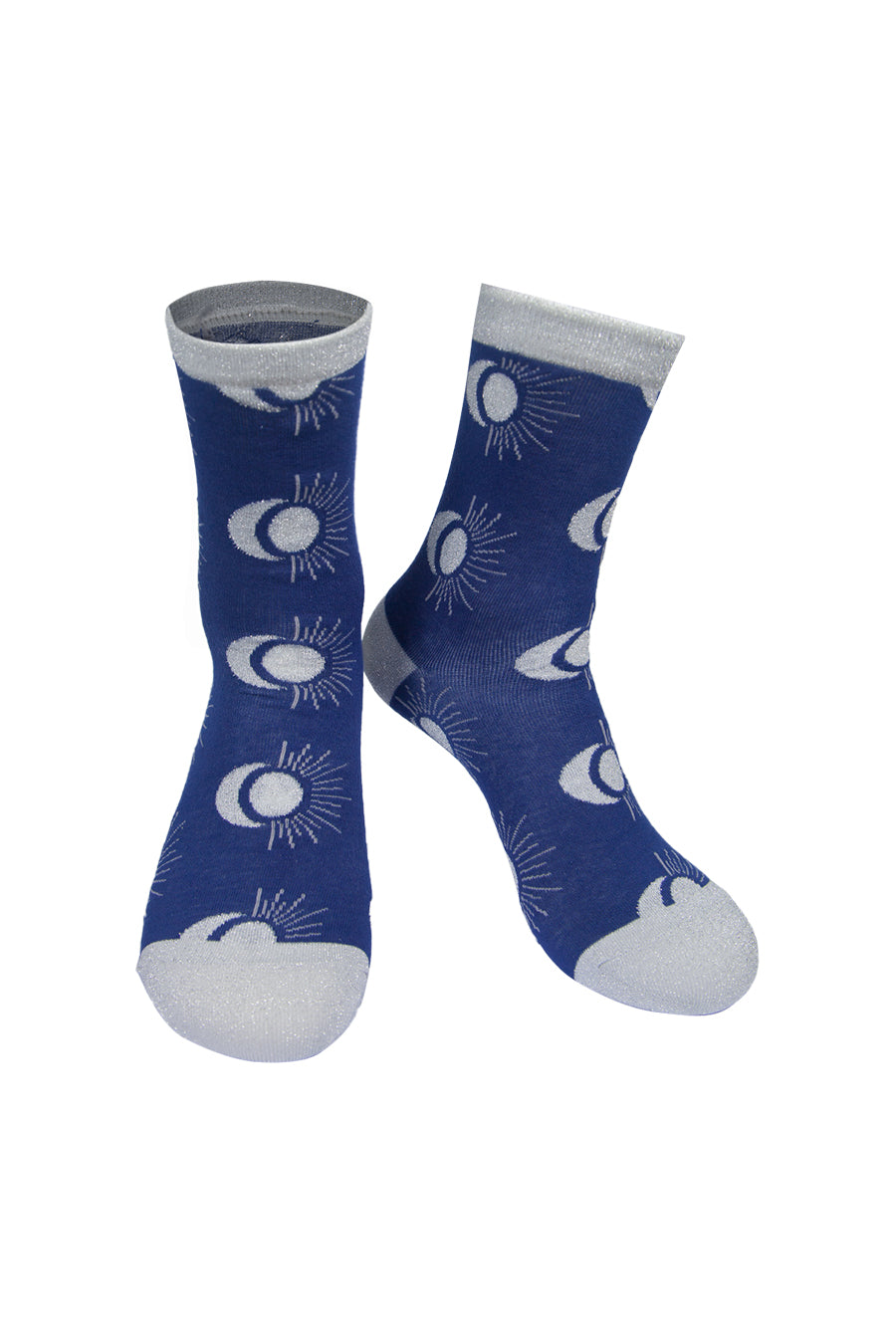 Women's Navy Blue Outline Sun and Moon Patter Bamboo Mix Socks