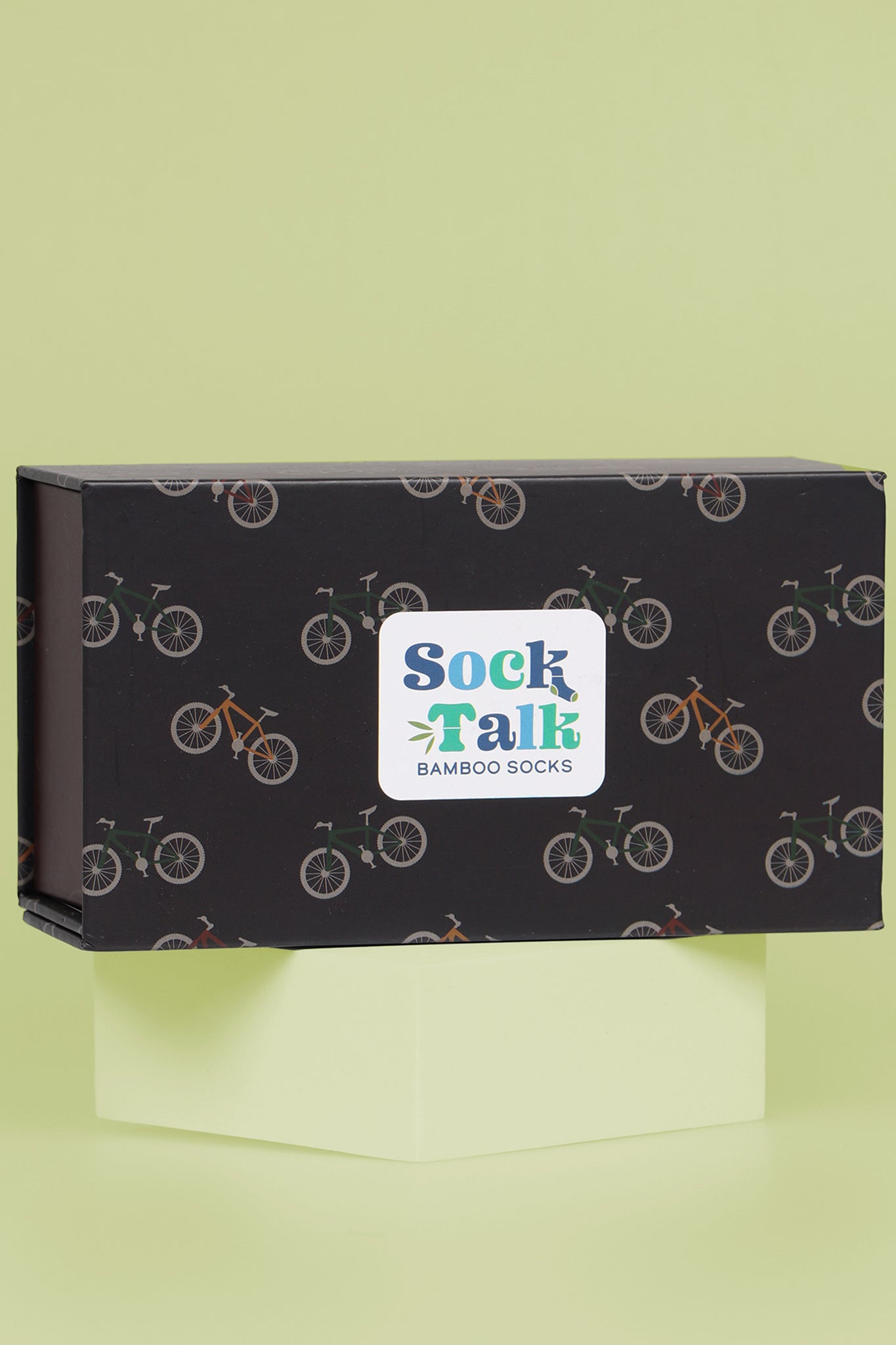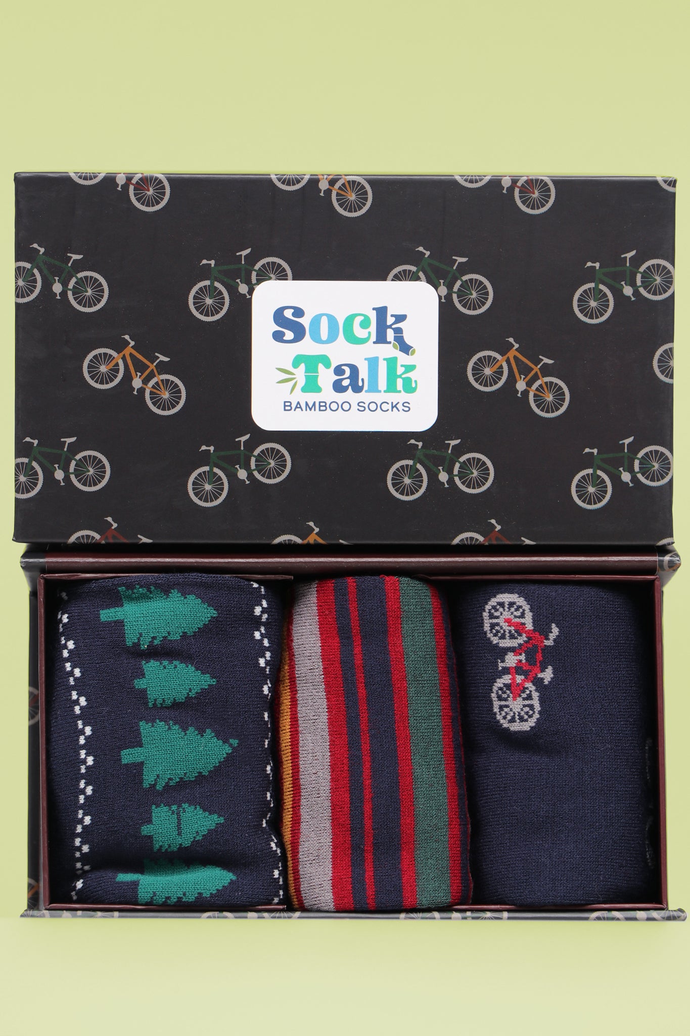 Men's Mountain Biking Bamboo Socks Gift Set. Three mountain bike-inspired bamboo dress socks in a matching bicycle print gift box. Ideal gift for any cyclist. UK Size 7-11