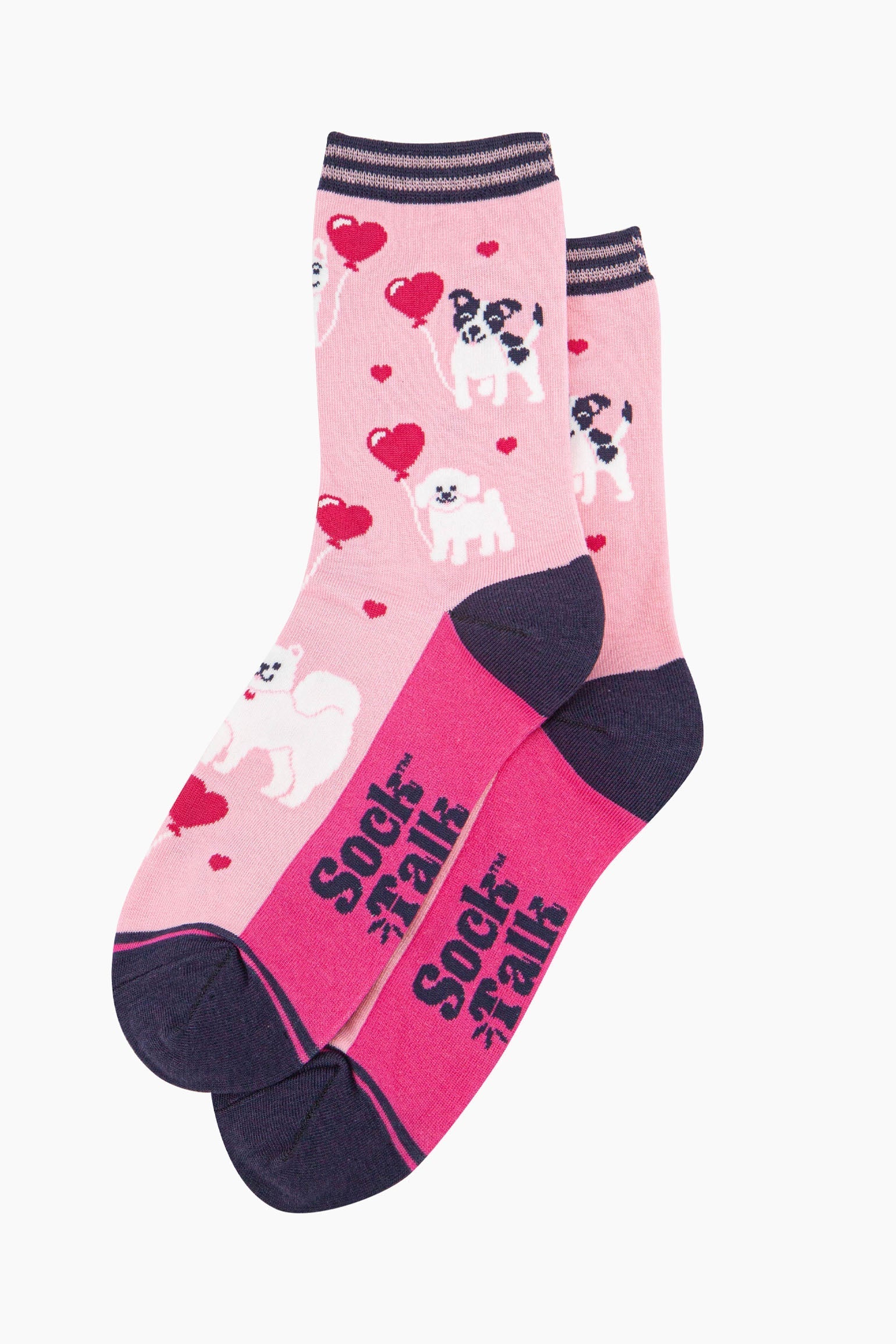Women's Bamboo Socks - Pink, Dogs with Balloon Hearts