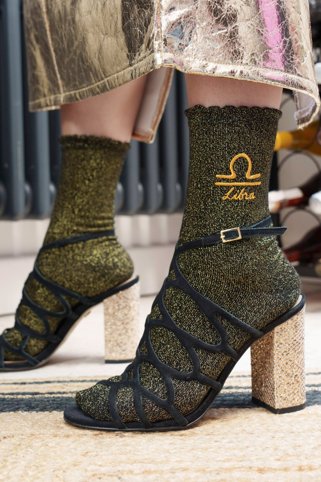 Designed in the UK, these glitter socks are crafted from soft blended cotton. Classic black socks with an eye-catching gold sparkle and an embroidered gold Libra star sign. Naturally breathable with a luxuriously comfortable scalloped cuff