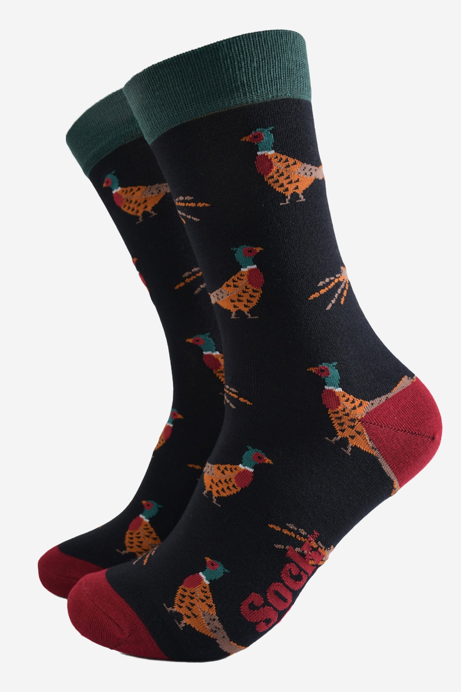 Designed in the UK, these pheasant socks are crafted from naturally breathable bamboo. Showcasing classic woodland pheasants these black socks are eco-conscious and feel luxuriously soft.