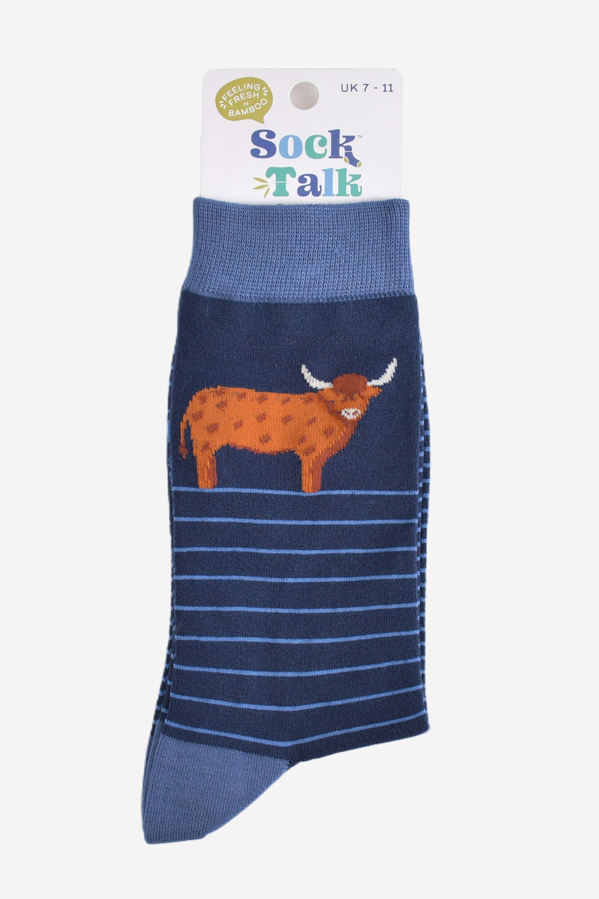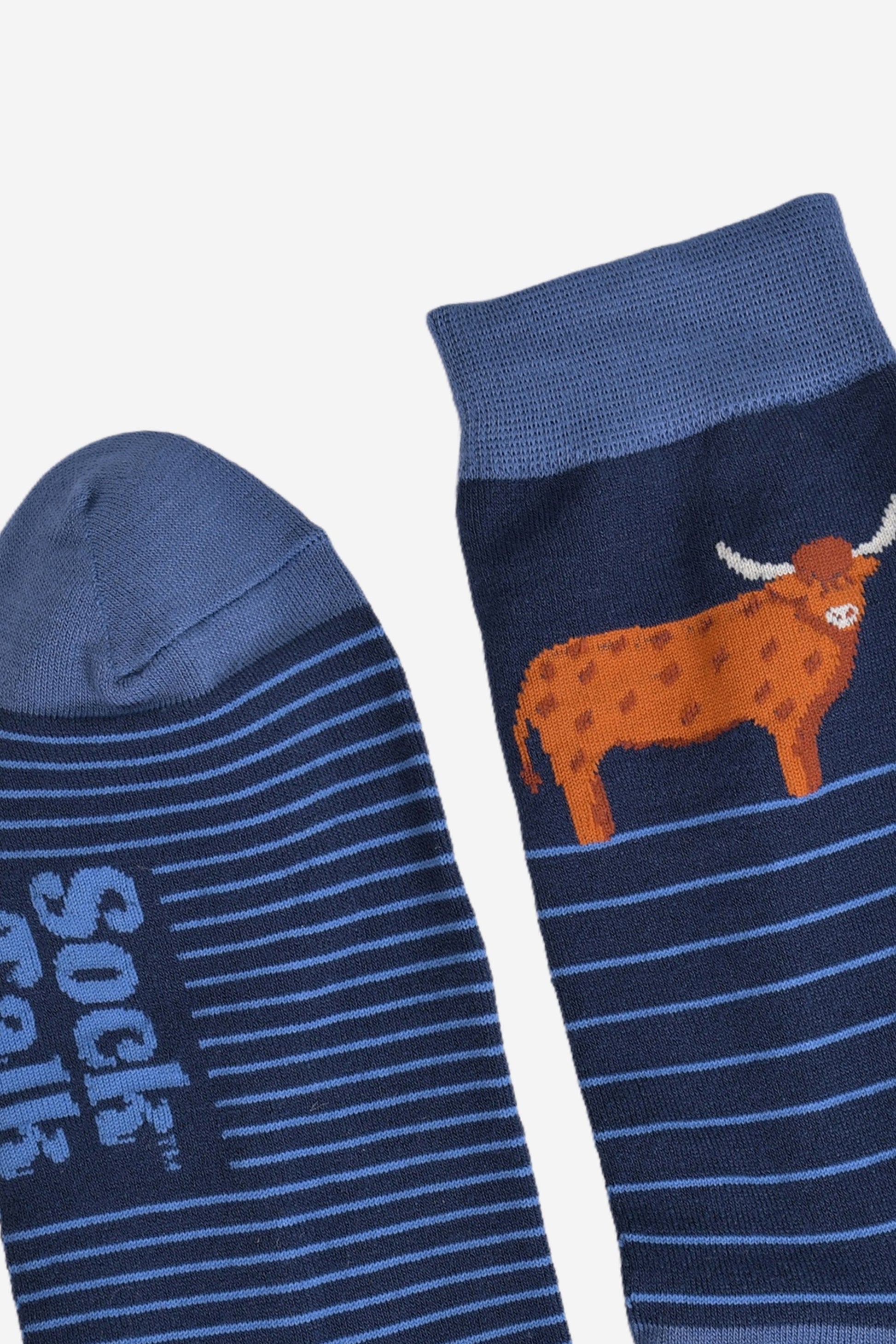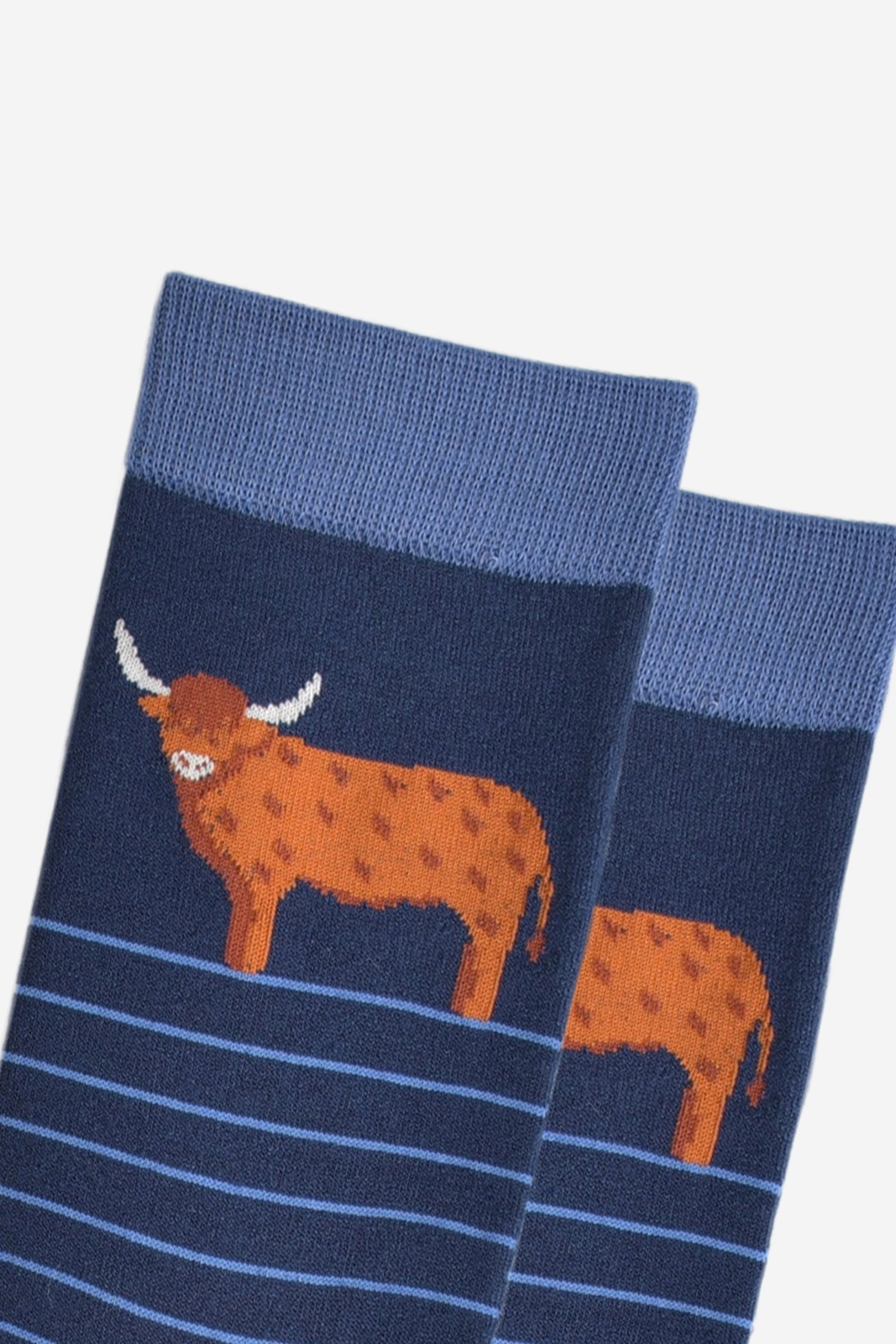 Men's Bamboo Socks - Navy Blue, Highland Cow Stripe