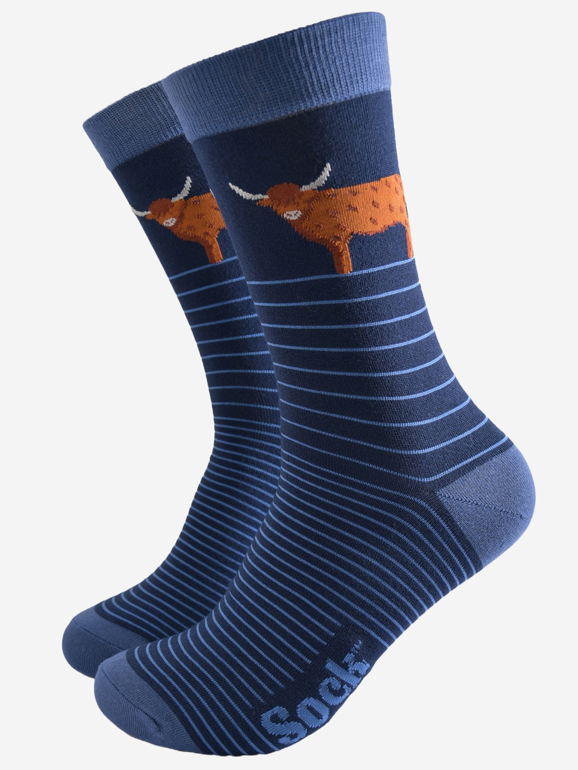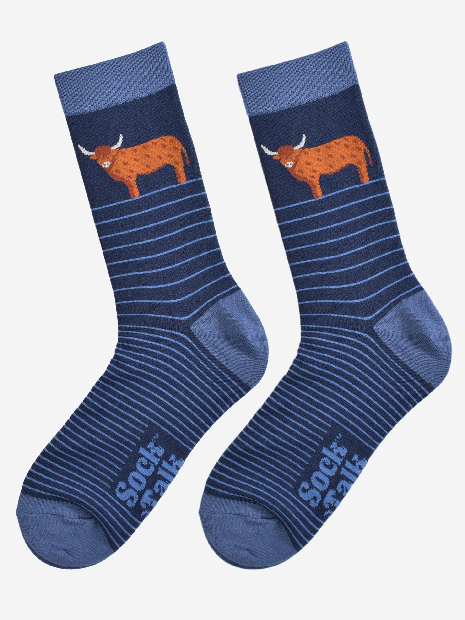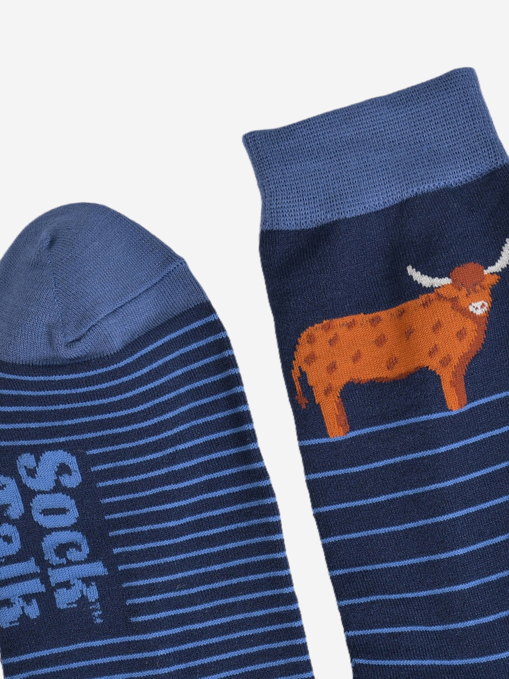 Designed in the UK, these classic striped socks are crafted from naturally breathable bamboo. Showcasing a Scottish highland cow and contrasting light blue accents. These dress socks are eco-conscious and feel luxuriously soft.