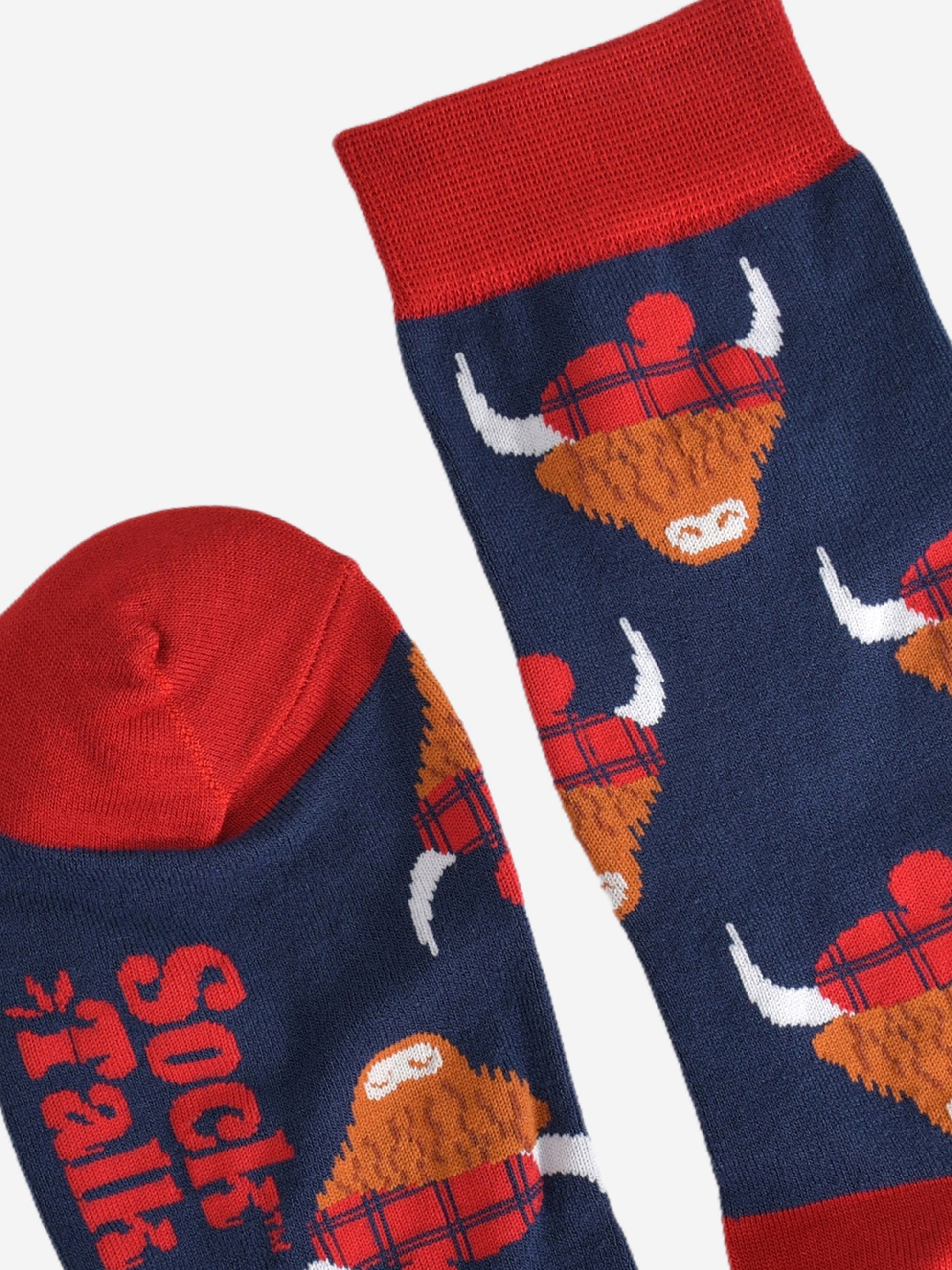 Designed in the UK, these socks are crafted from naturally breathable bamboo. Showcasing Scottish highland cows wearing traditional tartan hats. These red and blue dress socks are eco-conscious and feel luxuriously soft.