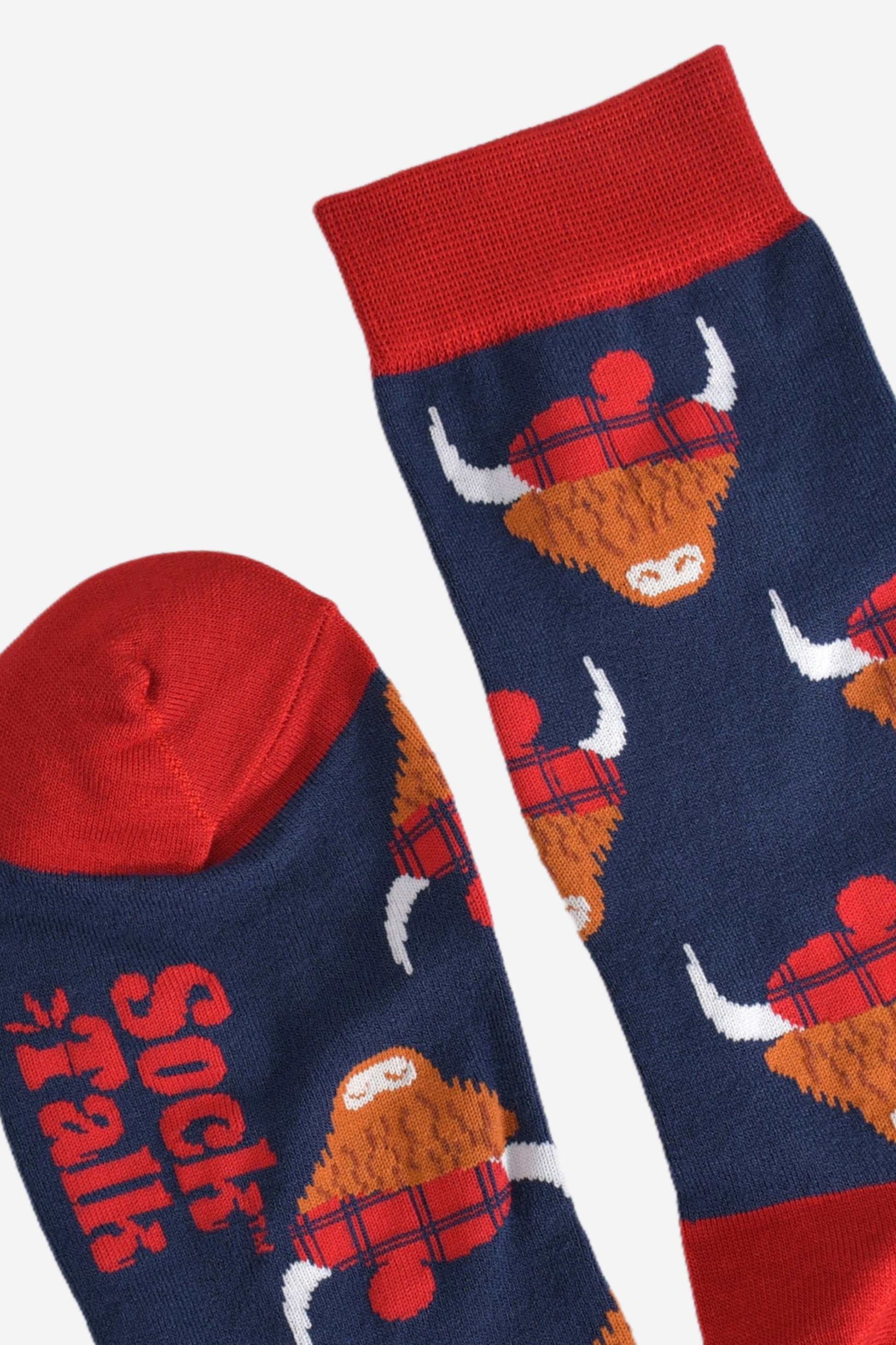 Designed in the UK, these socks are crafted from naturally breathable bamboo. Showcasing Scottish highland cows wearing traditional tartan hats. These red and blue dress socks are eco-conscious and feel luxuriously soft.