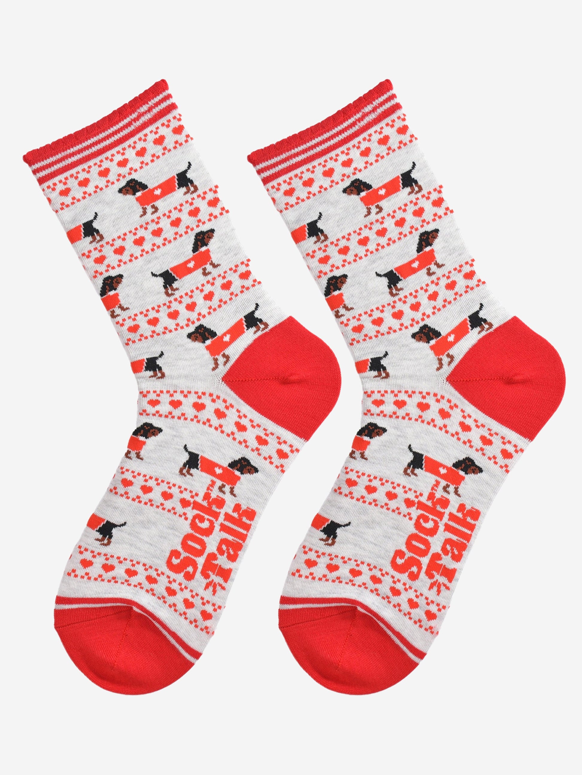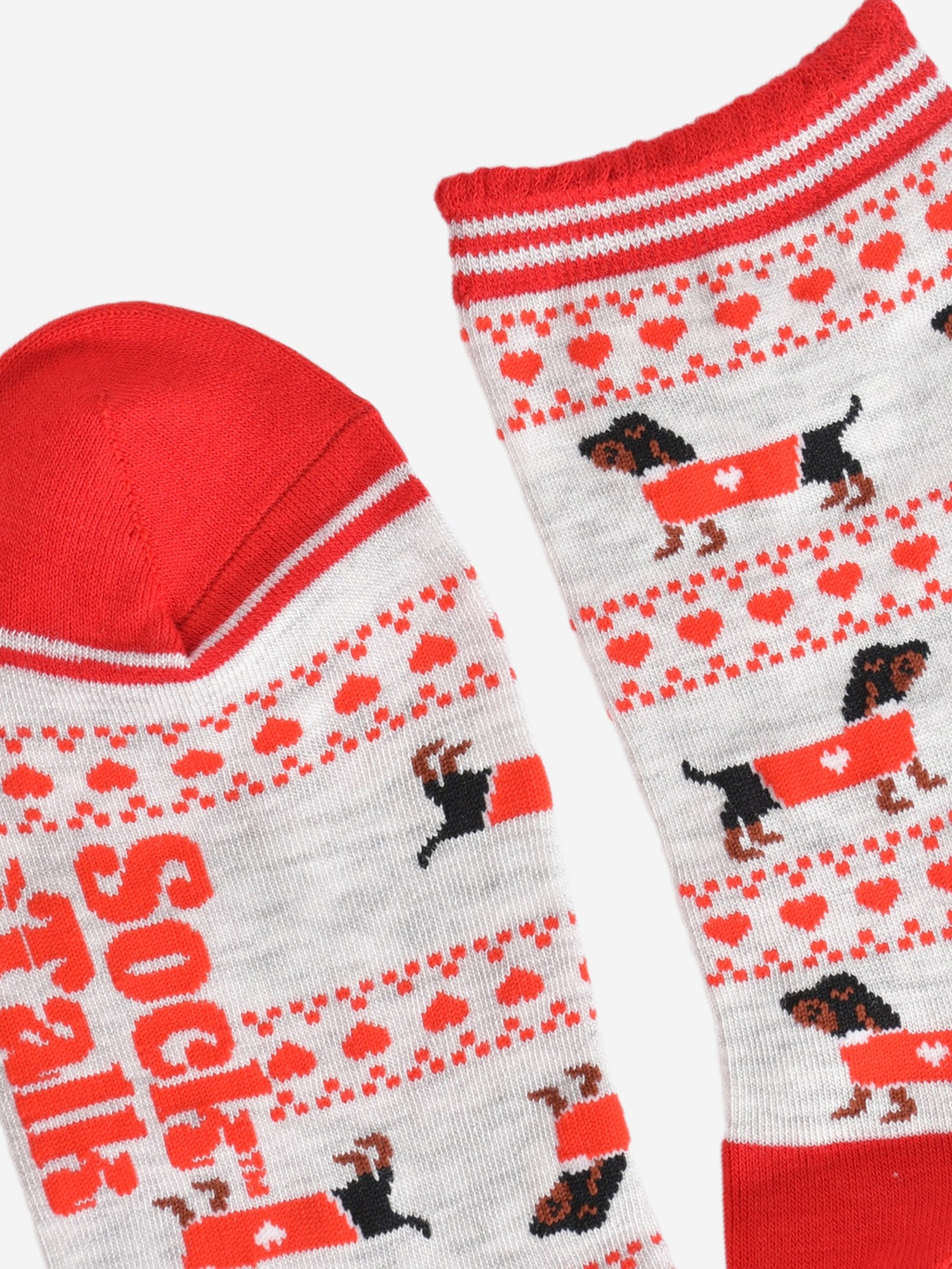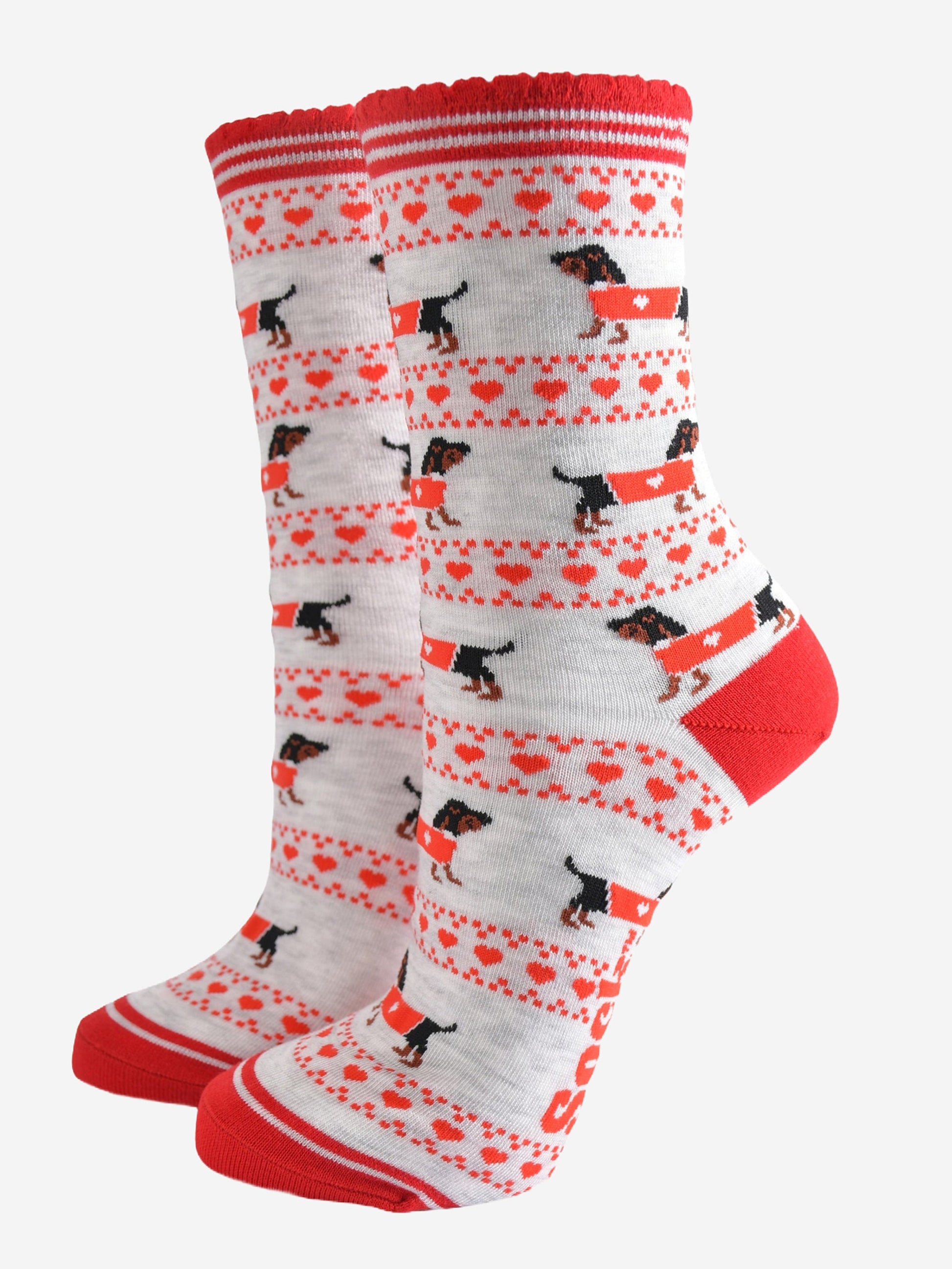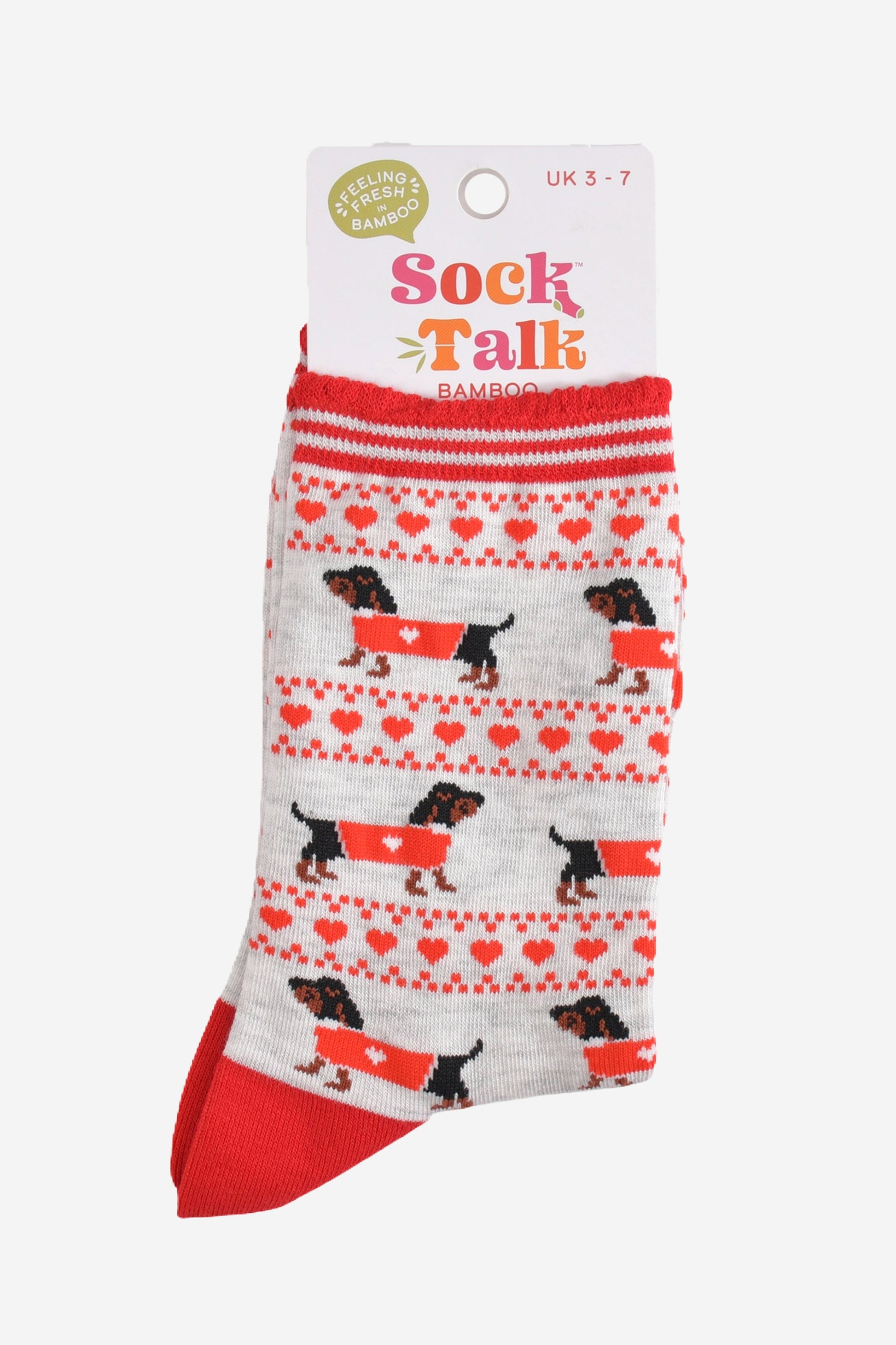Designed in the UK, these Fair Isle-inspired sausage dog socks are crafted from naturally breathable bamboo. A contrasting grey and red design showcasing playful dachshunds and red love hearts. Featuring a luxuriously comfortable scalloped cuff.
