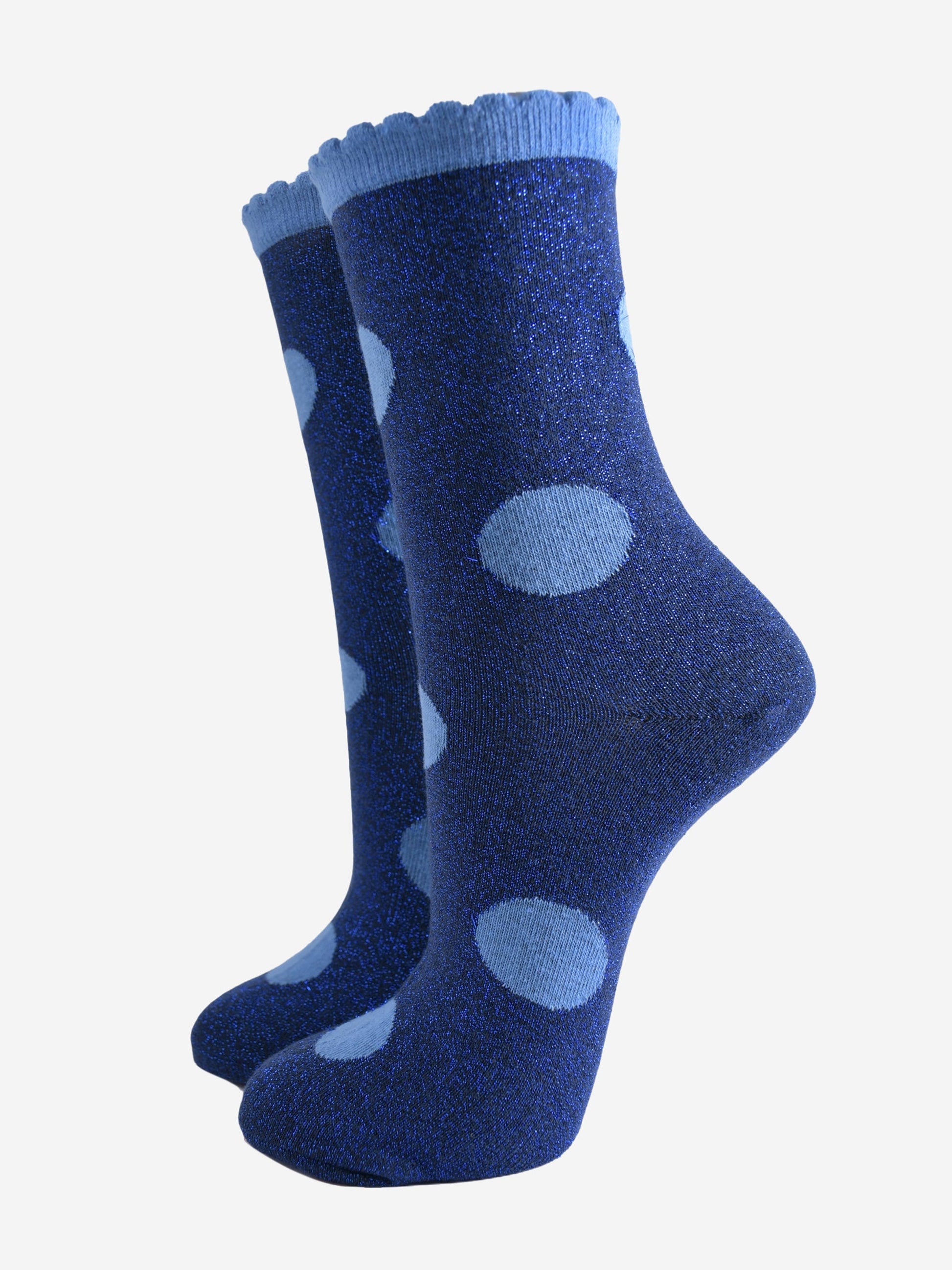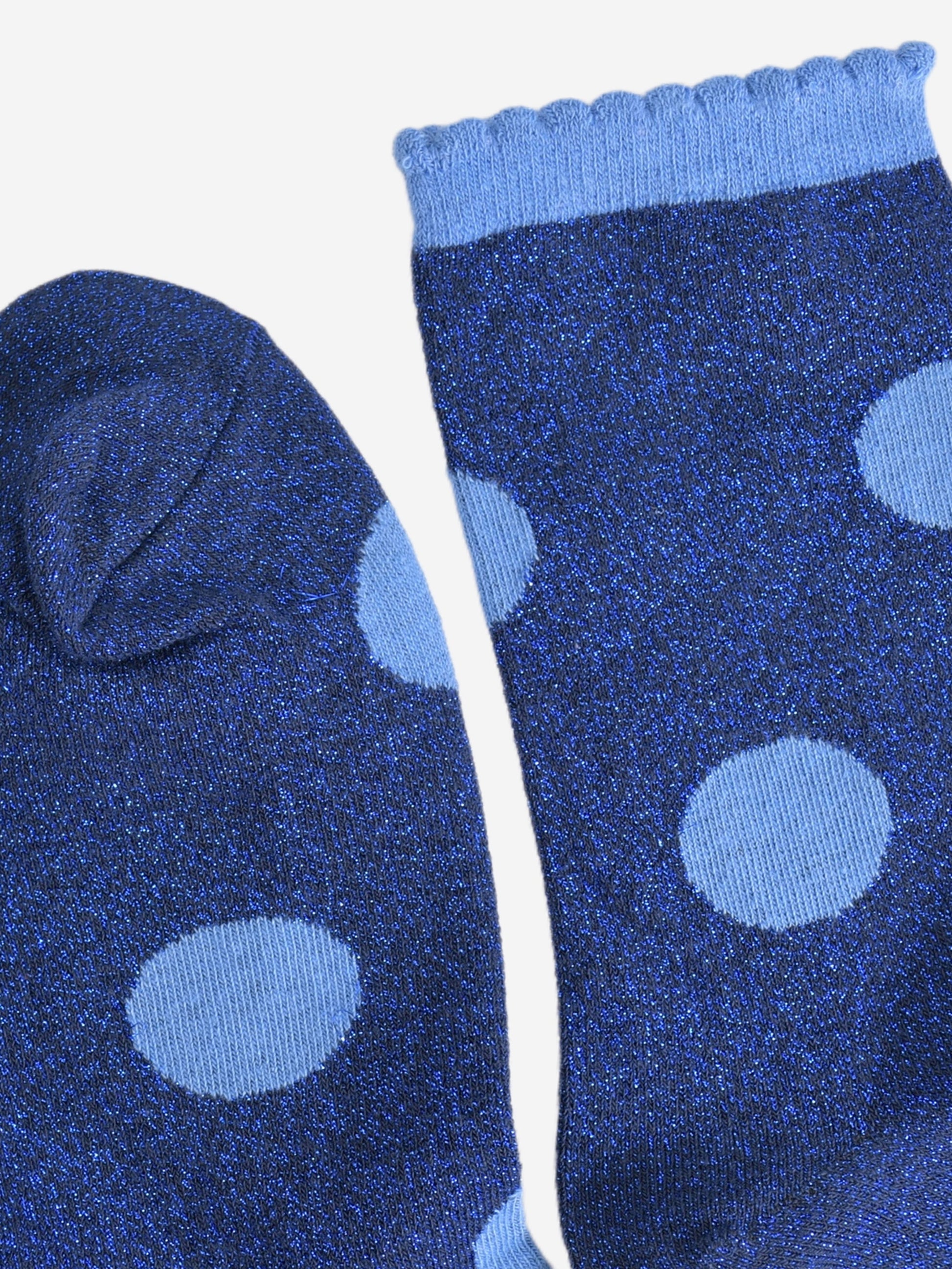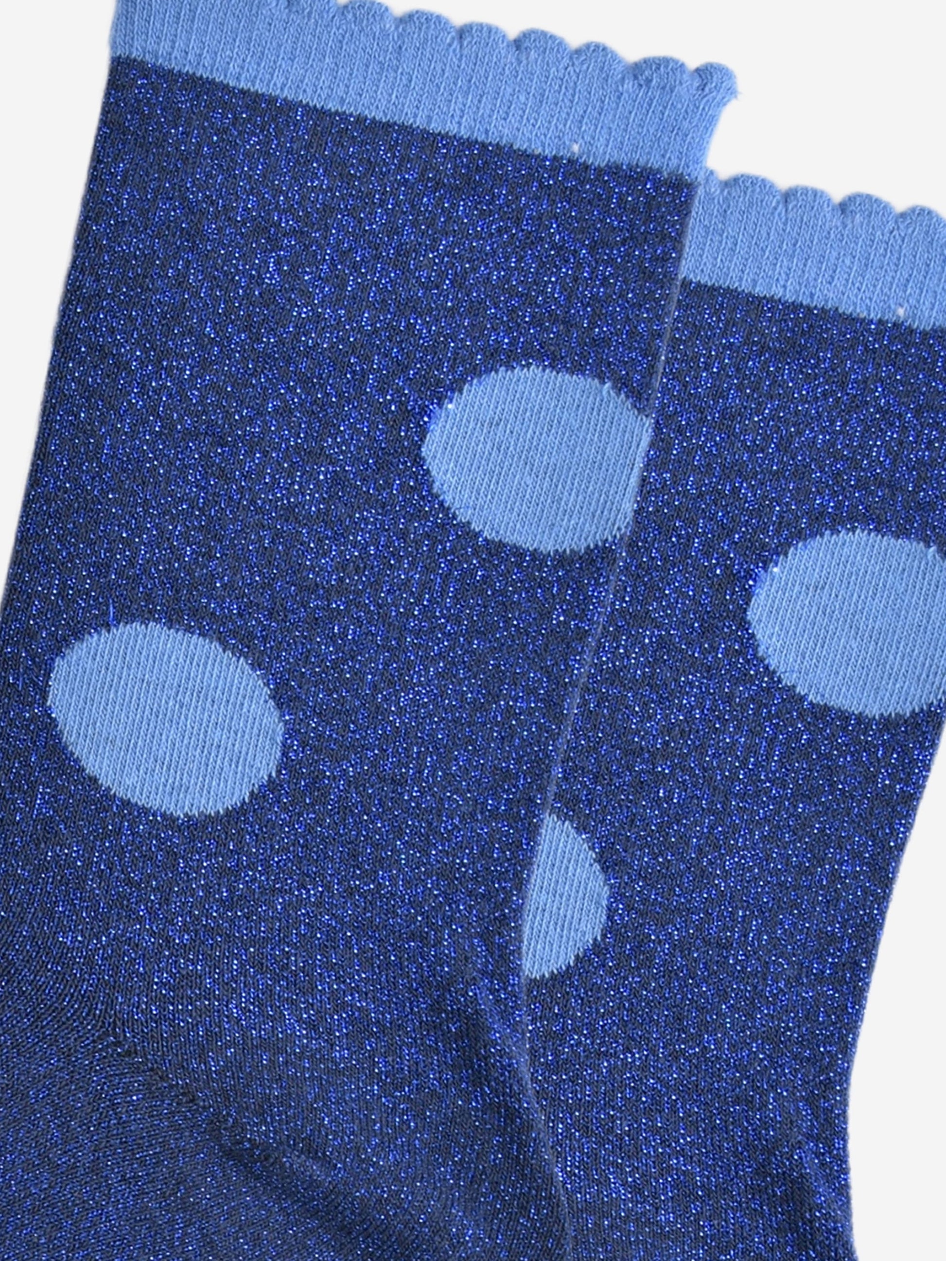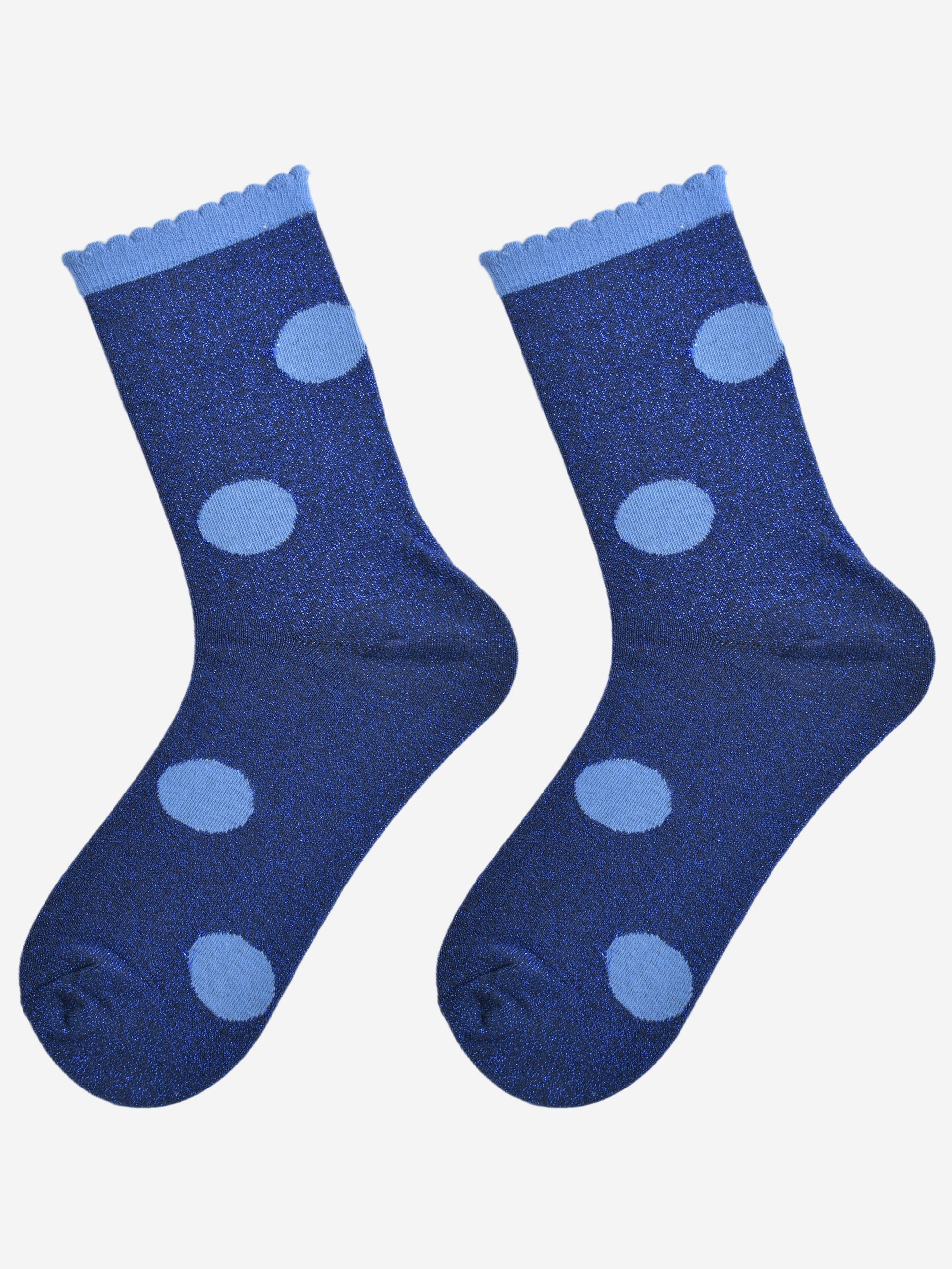 Designed in the UK, these glitter socks are crafted from soft blended cotton. Classic navy blue socks with a bold light blue polka dot pattern and eye catching sparkle. Naturally breathable with a luxuriously comfortable scalloped cuff.