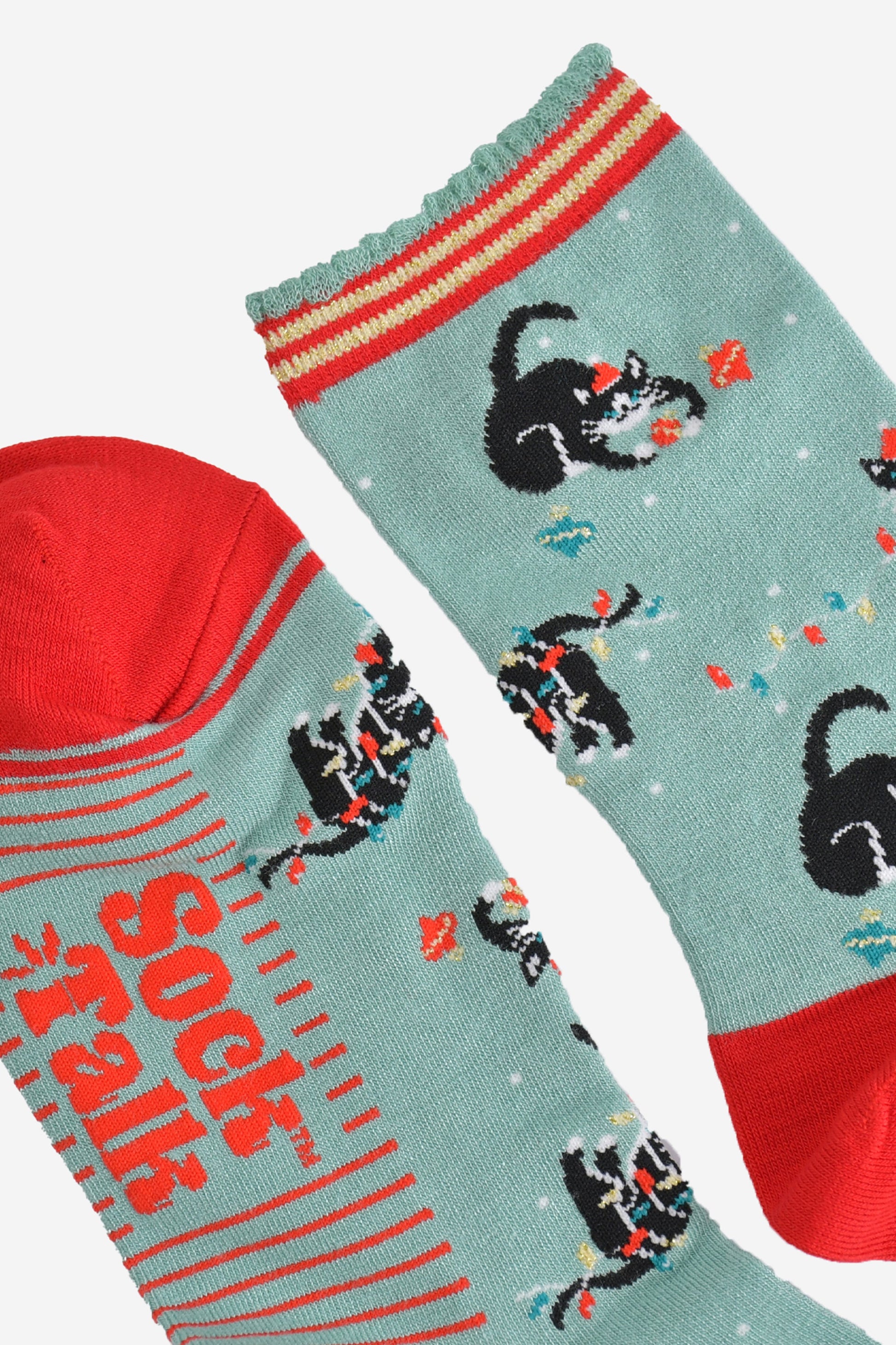 Soft to the touch luxury bamboo socks showcasing mischievous cats playing with festive lights and baubles. In a classic mint green with a red striped sole and cuff, these Christmas socks are designed in the UK and crafted from soft eco-friendly bamboo.