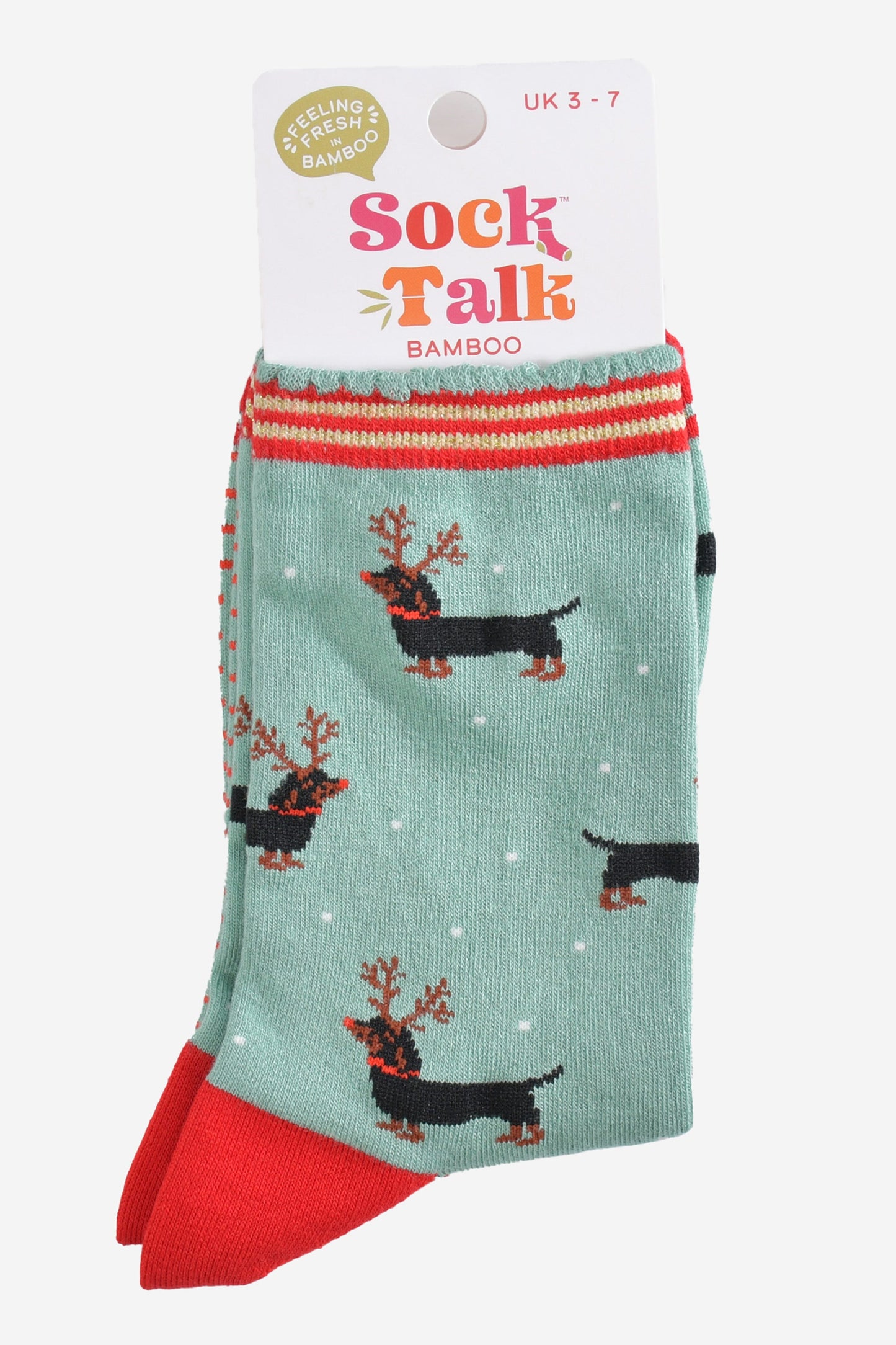 Women's Bamboo Socks - Mint Green/Red, Sausage Dog Reindeer