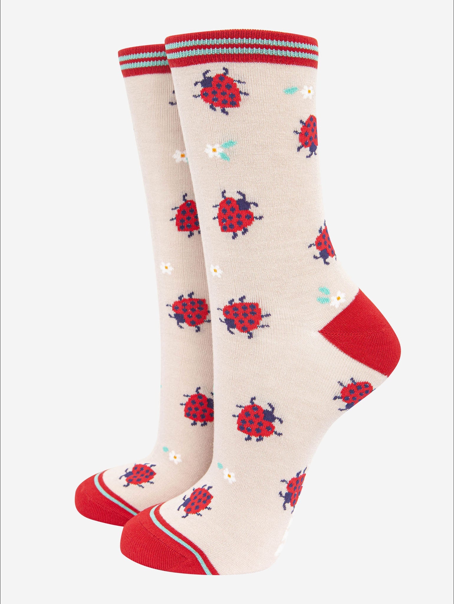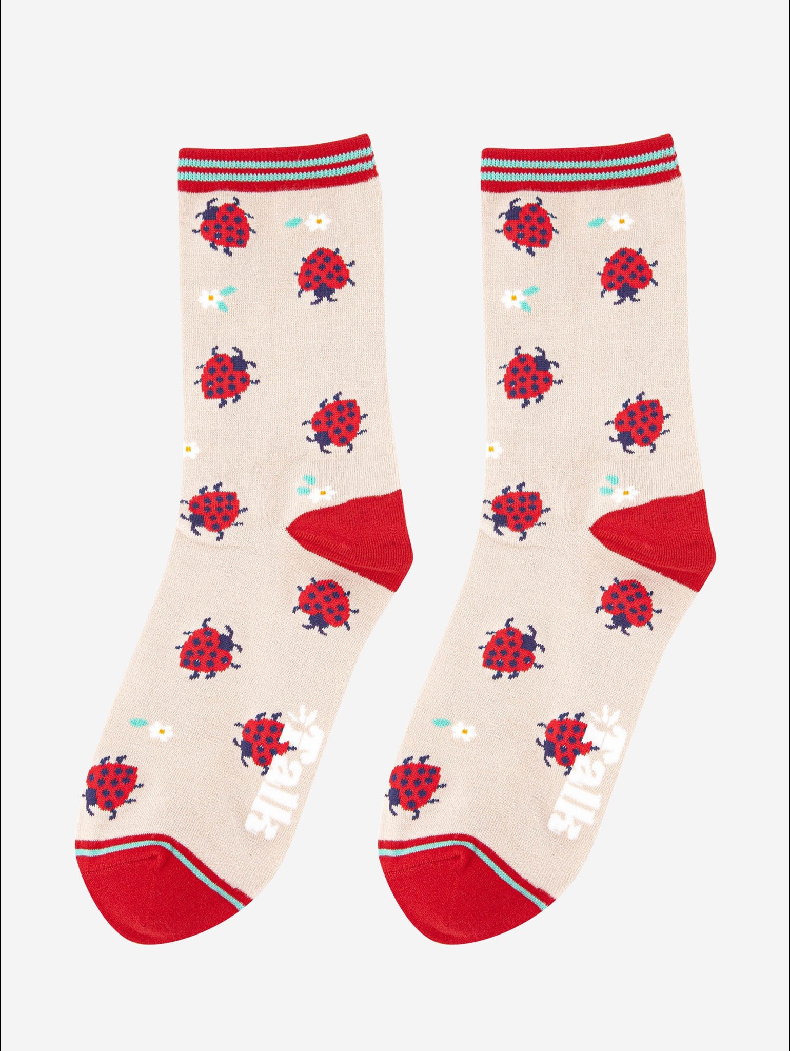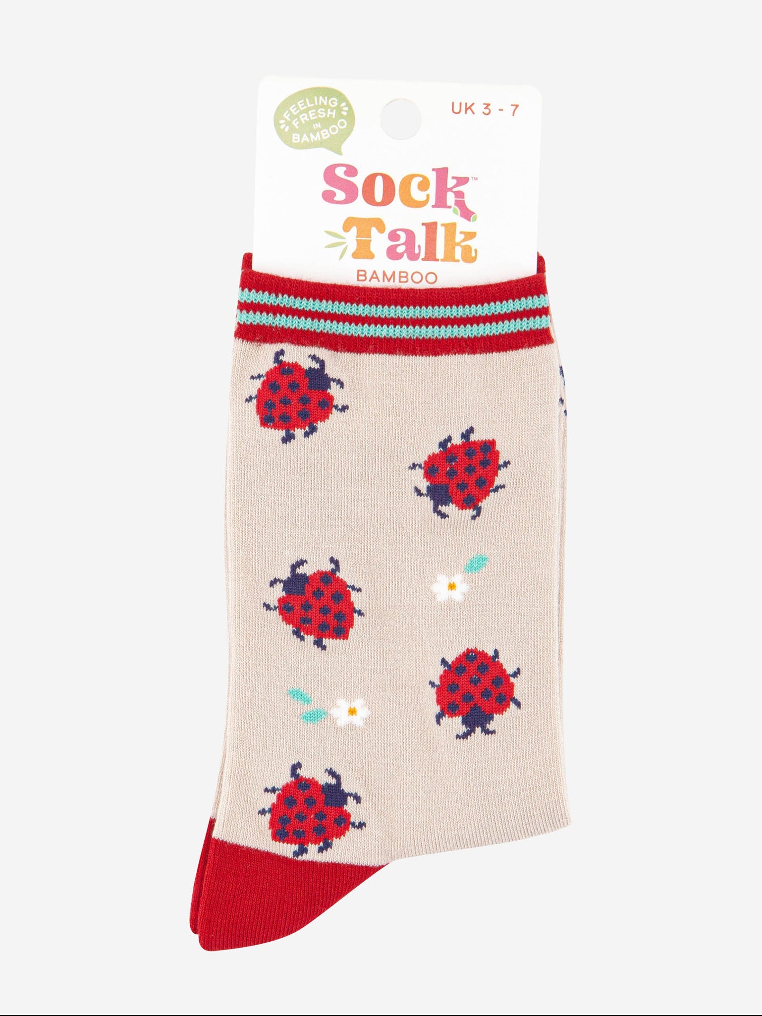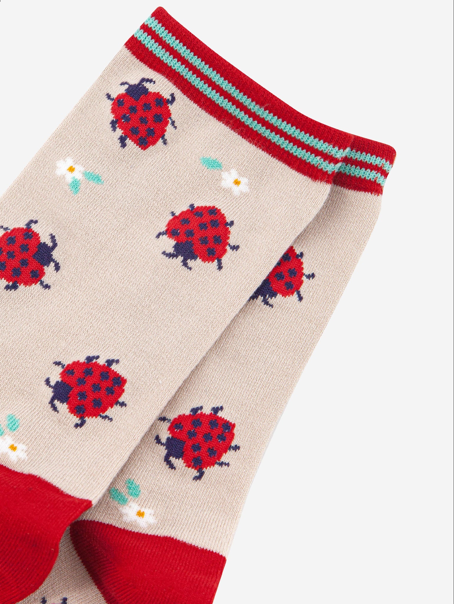 Designed in the UK, these red ladybird socks are crafted from naturally breathable bamboo. Showcasing bold ladybirds on a classic cream sock with a contrasting red heel and toe. These socks are eco-friendly and feel luxuriously soft.