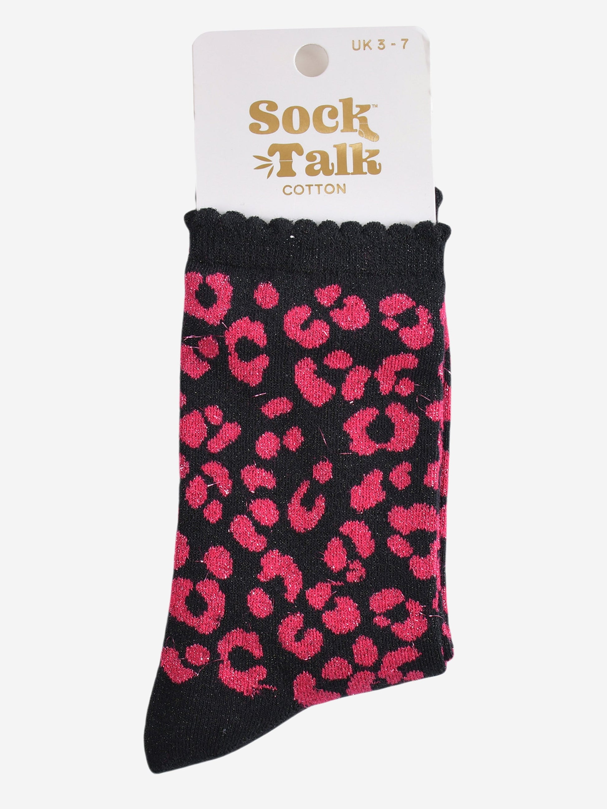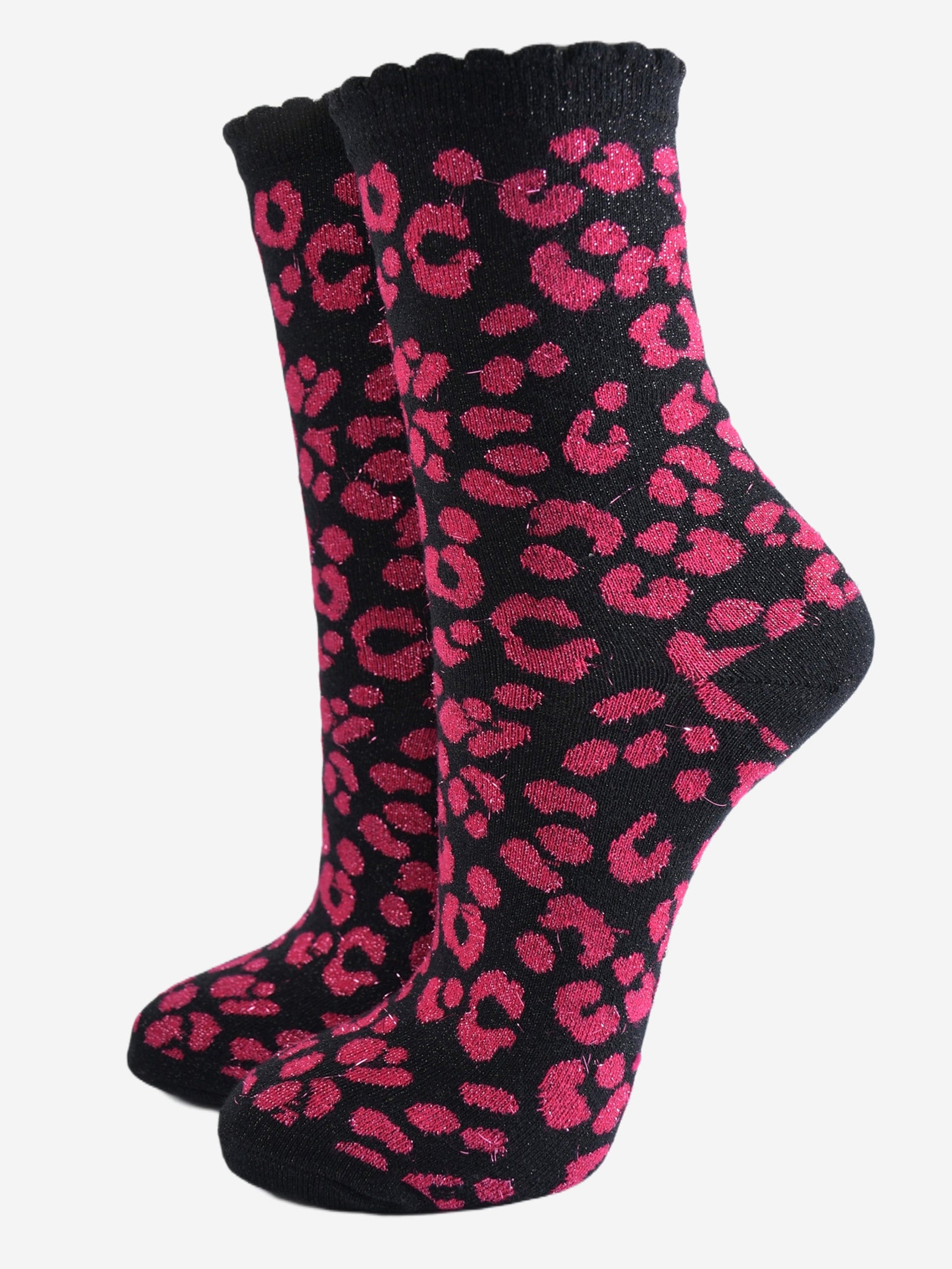 Designed in the UK, these glitter socks are crafted from soft blended cotton. Colourful pink socks with a black leopard print pattern and eye catching silver sparkle. Naturally breathable with a luxuriously comfortable scalloped cuff.